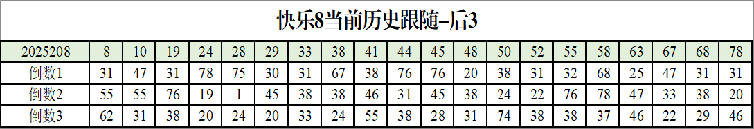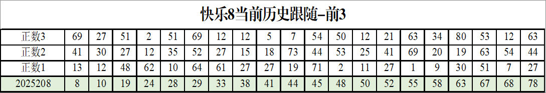 我感觉选热的同时,还要注意防冷条件开出,可以直接选取每个号码跟随出次前三的号码,也可以考虑把出次最后的三个数字加进去,不过这样可能号码太多,可以尝试。图上也能看出单独号码跟随的情况,我就不一一统计每个号码的出次了,我这里考虑提高概率,取每个号码历史跟随的前三号码和后三号码,根据2025208期的号码,我关注正数3和倒数3的号码号码为: