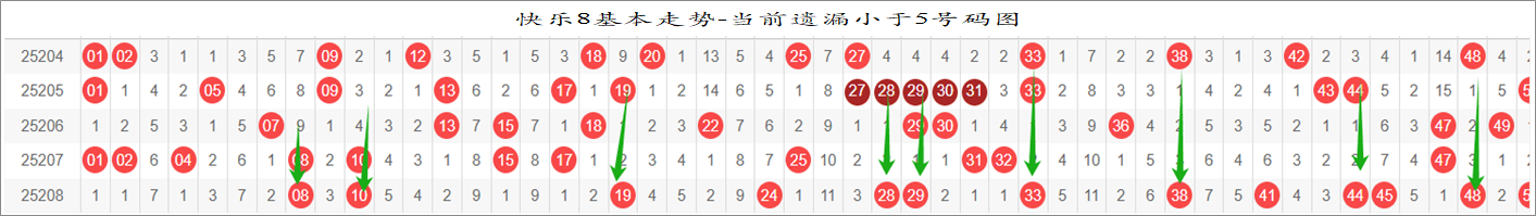 所以这个条件值得关注,从号码分布图上我们可以分析出,遗漏小于5期的号码有: