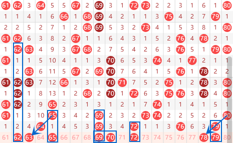 本期的63号数字我们要关注一下,属于三斜连号码,出号机会还是有的。本期我们要注意一下69号数字出三重的情况,这里做防守就可以了,毕竟上期才出了3个重号,本期不一定有三重号。本期的72号数字我们要注意走重的情况,62 65 69一直都是重号过来,本期很有可能轮到72号数字走重了。上期开出了76 79号数字,本期我们要注意有一个走重的情况。