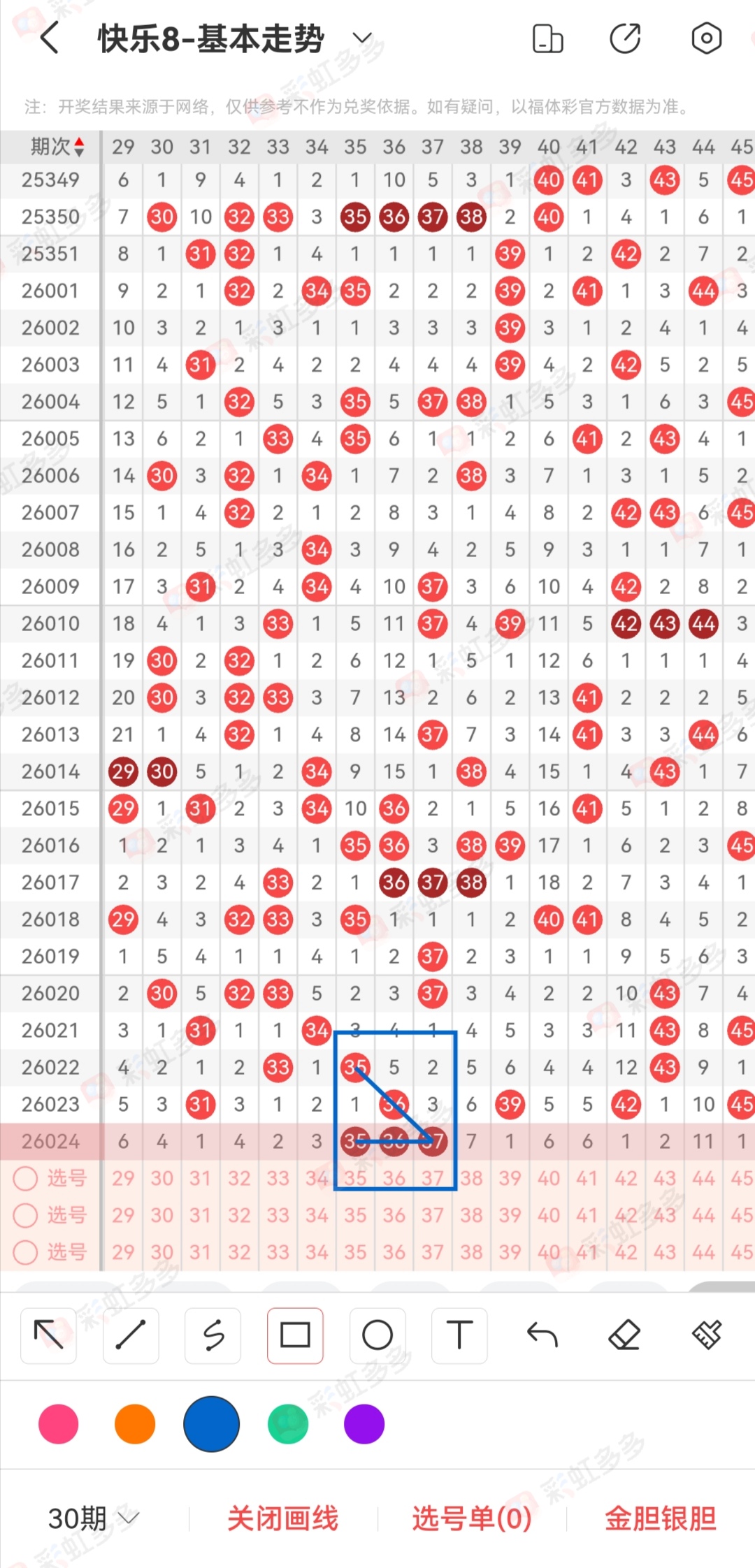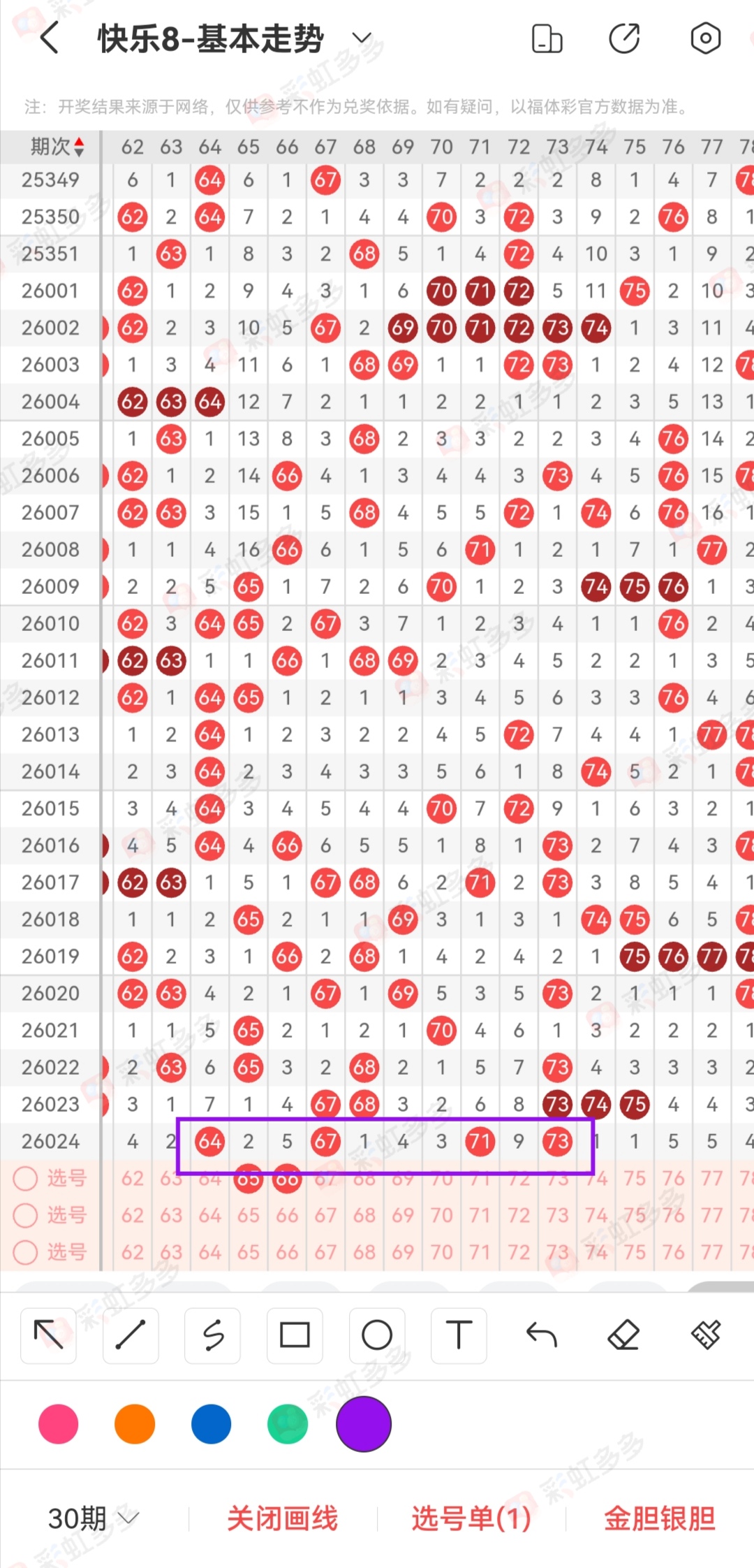 今天我们回顾一下昨天的出号结果。像这种类型的顺位变成同出连号的已经不知道出了多少次。如果每天都有这个类型的去打,我觉得还是有收益的。我们看一下每天顺位能够这么顺的应该不是太多,如果历史记录有出现高频率3顺位4顺位的。我觉得应该可以去防守,中一组可以多打10来天。类似2顺位第三期变成3顺位且3连的数据可以说50期内都不会出现太多。反而那种4顺位有尾巴的那种更容易出现。所以这个位置类型的我们可以做一下数据整理。今年26期数据刚刚开始,有些特殊的点以及高频率已经形成的位置需要记录。在后面的时间我们可以回过头来验证。本身快乐8就是一个很简单的数字游戏,我们不管这个到底有没有规律,但是只要你的假设点真的开出来了那么这个就是有规律的。运气好的人会经常中大奖,也不会说需要什么特别的方法。这就是个人运气。真正有逻辑的反而会有掣肘,因为组合考虑的是一个方向,能不能由点到面,这个是我们自己征服自己的理由。比方说两个相同方向的我会选择1个,两个相反的号码我也选择一个。但是别人不一祥,考虑一个综合中奖率。就是在不亏的前提,能赢多少全靠开奖。他会把4码全打。但是我不会这样子,更多的时候就是为了验证自己,当然这里也没有问题,因为关联号码确实有机会全开也有机会不来。所以看个人组合习惯。