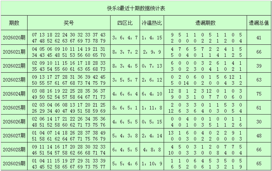 一、快乐8第2026030期奖号分析(定义:遗漏0-2期号码为热码,遗漏3-6期号码为温码,遗漏7期及7期以上号码为冷码,重码为上期开出奖号,邻码为上期没有出现,但与上期奖号差值为1的号码,例如上期开出奖号04,没有出现号码03和05,则本期03和05都为邻码,其它则为孤码。