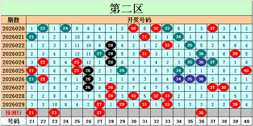 目前第二区包含11个热码:重码5个27、29、31、33、39,邻码5个26、28、30、32、38,孤码1个37;包含7个温码:邻码2个34、40,孤码5个21、22、25、35、36;包含2个冷码:邻码0个,孤码2个23、24;号码冷温热个数比为2:7:11,重号、邻码、孤码个数比为5:7:8。