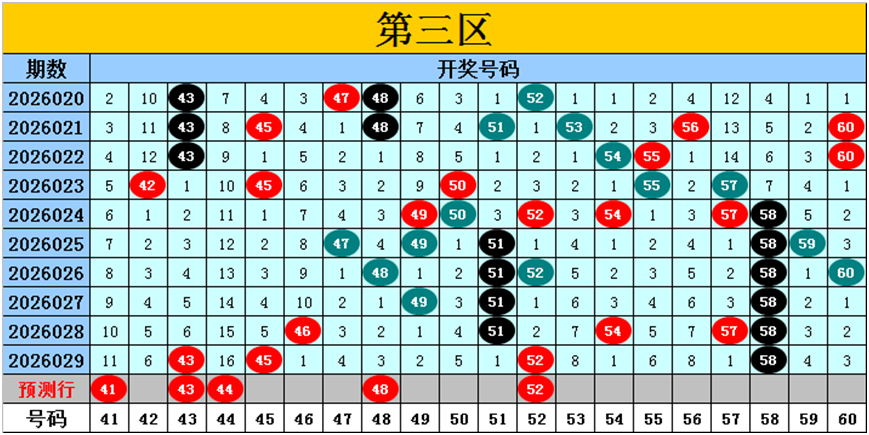 目前第三区包含9个热码:重码4个43、45、52、58,邻码3个46、51、57,孤码2个49、54;包含7个温码:邻码2个42、59,孤码5个47、48、50、55、60;包含4个冷码:邻码2个44、53,孤码2个41、56;号码冷温热个数比为4:7:9,重号、邻码、孤码个数比为4:7:9。
