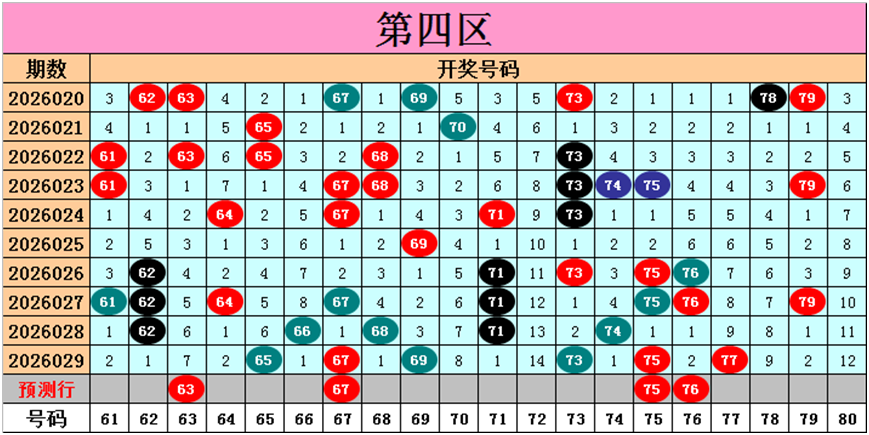 目前第四区包含15个热码:重码6个65、67、69、73、75、77,邻码5个64、66、68、74、76,孤码4个61、62、71、79;包含0个温码;包含5个冷码:邻码3个70、72、78,孤码2个63、80;号码冷温热个数比为5:0:15,重号、邻码、孤码个数比为6:8:6。