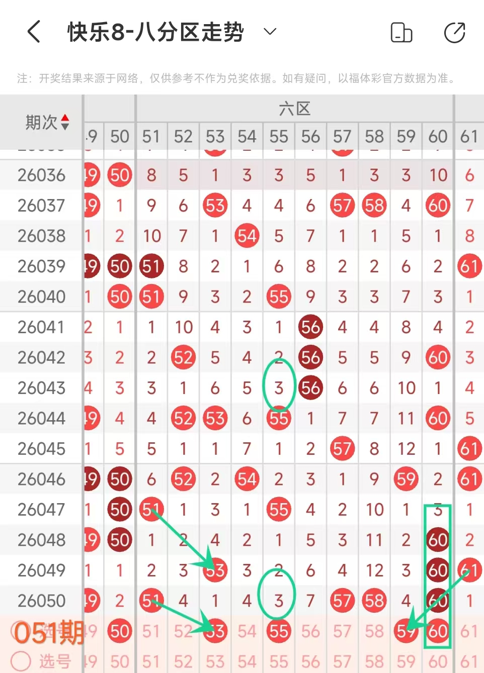 上期六区开出51 57 58 60这4个号码,本期应该出3个。