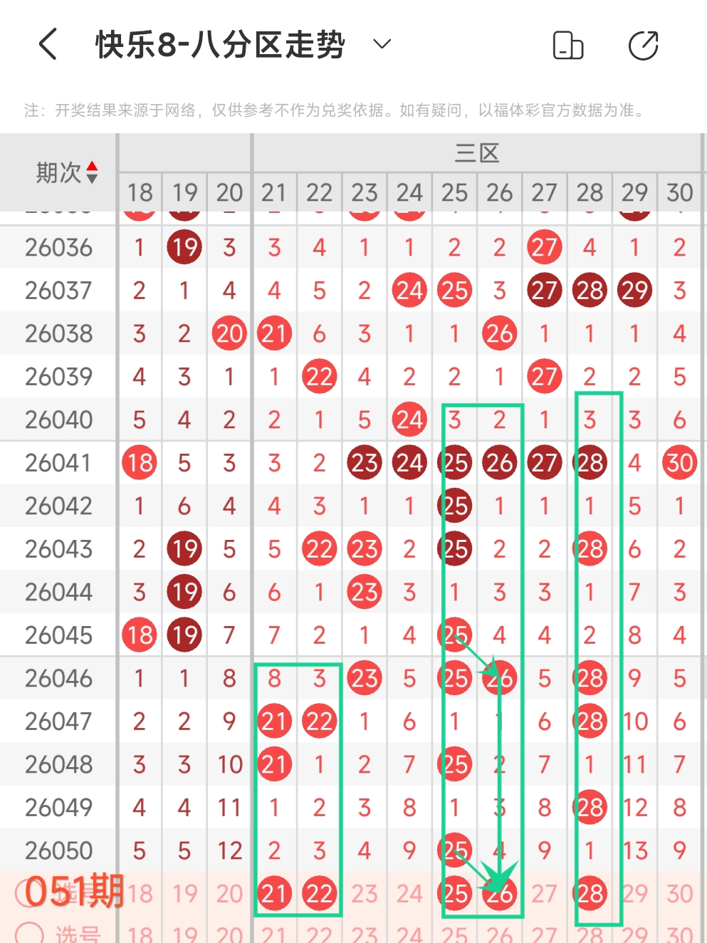 上期三区开出25这1个号码,本期考虑2个。