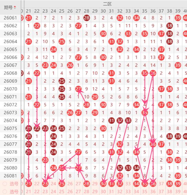 二区间注意打底号21.23.25.28.30.32.34.35.36.39中关注3-4码开出机会,