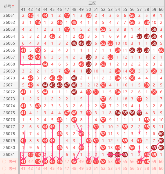 而三区的打底号是41.43.44.45.48.51.54.57.中参考3-4码开出机会,