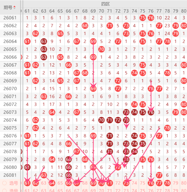 .那么四区间关注的打底号是62.64.67.69.70.71.73.76.78中参考3-4码开出机会