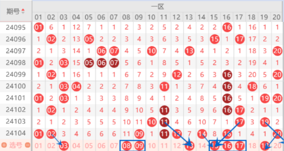 上期开出了01 02号数字,本期我们注意一下03号数字的出情况就行了。本期的08号数字我们注意一下出号情况,属于四斜连号码,出号机会是很大的。上期开出了11 12 14 16号数字,我们注意出一重一夹号的情况,可以重点关注一下13 16号数字的出号情况,可以重点关注一下16号数字出重的情况。本期的17号数字我们也是要重点关注一下,属于151走势,这种号码也是经常出号的。