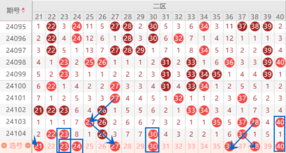 上期开出了22 23号数字,本期我们注意一下出重的情况,重点关注一下23号数字出重的情况。本期的21 24 25号数字我们也是要关注一下出号情况的,毕竟22 23同出是经常带的21号数字的,本期的24 25出一个号码的机会也是很大的,我们要重点关注一下。本期的27号数字是属于V型号码,可以关注一下出号情况。本期的30号数字我们注意一下出重的情况,毕竟上期开出了20 30号数字,本期是有机会重一个号码的。本期的36号数字我们注意一下出号情况。