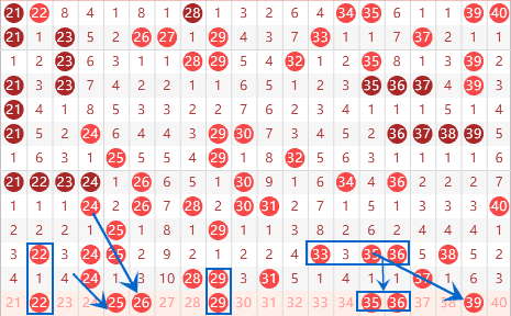 该区间的22 26我们要注意出一个号码的情况,两个都是空三中心号,尤其是26号数字出号机会比较大一点。连号空一带号28 29 31本期我们注意一下出重号的情况。连号空一带号33 35 36本期应该是要回补号码的,我们可以重点关注一下35 36的出号情况。