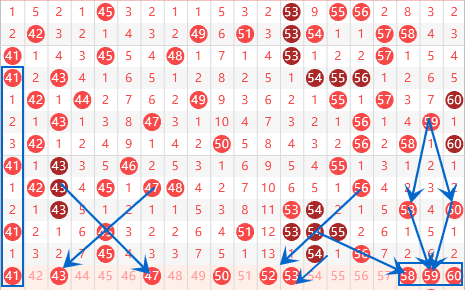 本期的41号数字是属于321走势,我们可以关注一下,出号机会还是大的,42 43 44有两期没有出号了,本期我们要关注一下落号的可能性。尤其对43 47形成了中心对称类型,可以关注一下他们同出的情况。本期的52 53我们要注意同时出号的情况。本期的59号数字是属于平行四边形,可以关注一下。