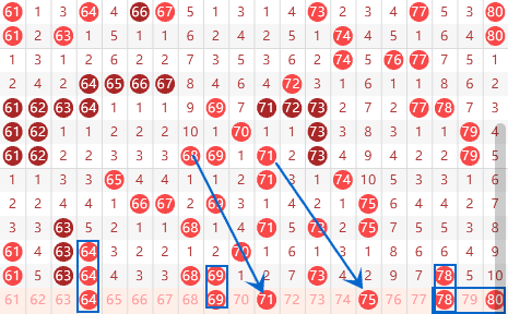 连号空一带号61 63 64本期我们也是要注意出3重号的情况的,重点关注一下61号数字出三重的可能性。本期的71号数字是属于斜四连号码,我们可以关注一下。上期开出了73 78两个号码,那么76 80这两个号码我们就要注意了,出一个号码的情况还是比较大的。