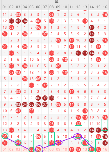 本期一区胆尾9尾5尾,边号2 4 7 8 9 10 12 14 15出1-2码,重号1 3 8 9 13 16出一码,形态上5 6 14是斜连号,上图已勾画,短期规律,隔一期号出3期,本期6 12 15大概率三出一,连号下面走重号,那么本期大概率8 9二出一,其次同尾号出2期,本期要防同尾号5 15,结论关注五码5 6 9 14 15防16
