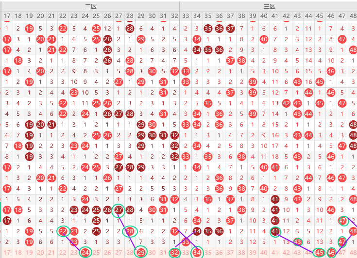 二区胆尾2尾4尾,边号18 20 22 24出1码,重号19 23二出一,形态上24 29 32是斜连号,上图已勾画,短期规律隔一号隔一期出一次那么本期22 25 28 32出一码,二区本期应该是走热趋势大概率出3-5码,结论关注五码18 24 25 29 32  防17