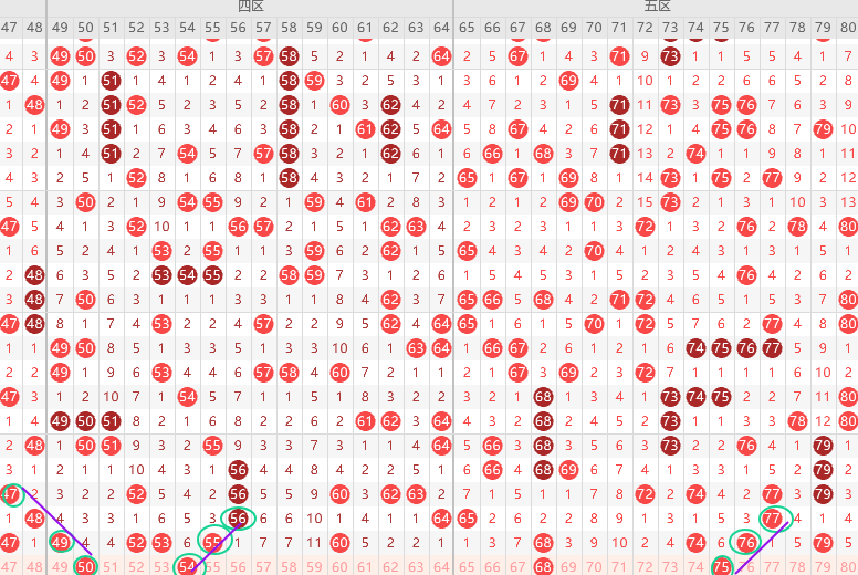 四区胆尾1尾3尾,边号50 51 52 53 54 56 59 61出一码,重号49 52 53 55 60出一码,形态上50 54是斜连号,上图已勾画,缩小范围四区大概率是走冷趋势出2-4码,连号下面出重号概率大那么本期如果有重号先看52其次53,5开头52 54二出一,6开头防守2码61 64,结论关注五码52 53 54 61 64