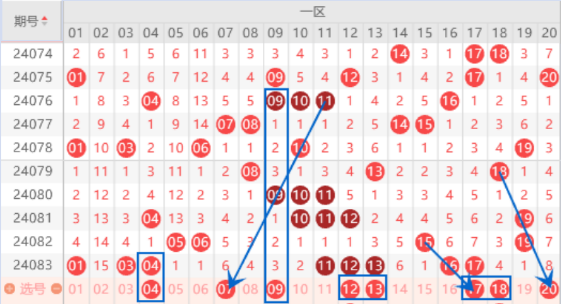 上期开出了01 03 04号数字的连号空一带号,本期我们注意一下出一个重号的情况,重点关注一下04号数字出号重的情况。本期的07 09号数字我们注意一下出号情况,注意防守一下同出的情况。上期开出了11 12 13号数字,本期我们注意一下出重的情况,重点关注一下12 13号数字的出号情况就行了。上期开出了16 17号数字的连号,本期我们也是要注意出一个重号的情况。本期的20号数字是属于678的走势,本期我们注意一下出号情况。