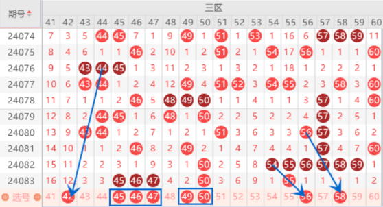 该区间的冷号41 42应该会出一个号码了,本期我们关注一下42号数字出号情况。本期的44号数字我们注意一下出号情况,毕竟上期开出了45 47号数字,有可能会把44号数字带出来的。上期开出了45 46 47号数字的三连号,本期我们注意出重号的情况。本期的49号数字我们注意一下出号情况,属于空二对称的号码,本期还是有出号机会的。本期的56 57 58号数字我们要注意出一个号码的情况,重点关注一下56 58号数字出一个号码的情况。