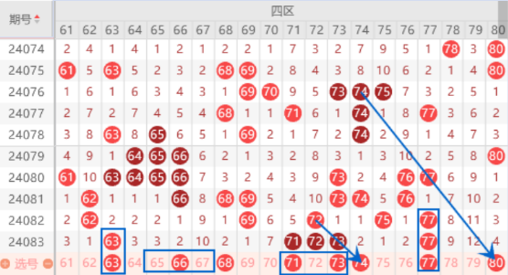 本期的65 66 67号数字我们要注意出号情况了,重点关注一下66号数字的出号情况。本期的68号数字我们也是要注意一下出号情况,属于132乱序走势,出号机会还是有的。上期开出了71 72 73号数字的出号情况,重点关注一下71 73号数字出一个号码的情况。本期的77号数字我们注意一下出三重号的情况,可以防守一下77 80号数字同出的情况。