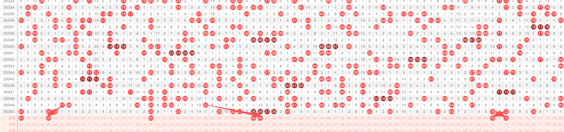 本期关注重码01,05,06,20,24,30,32,33,35,36,37,38,40,52,55,62,64,70,72,76 关注出3-6枚