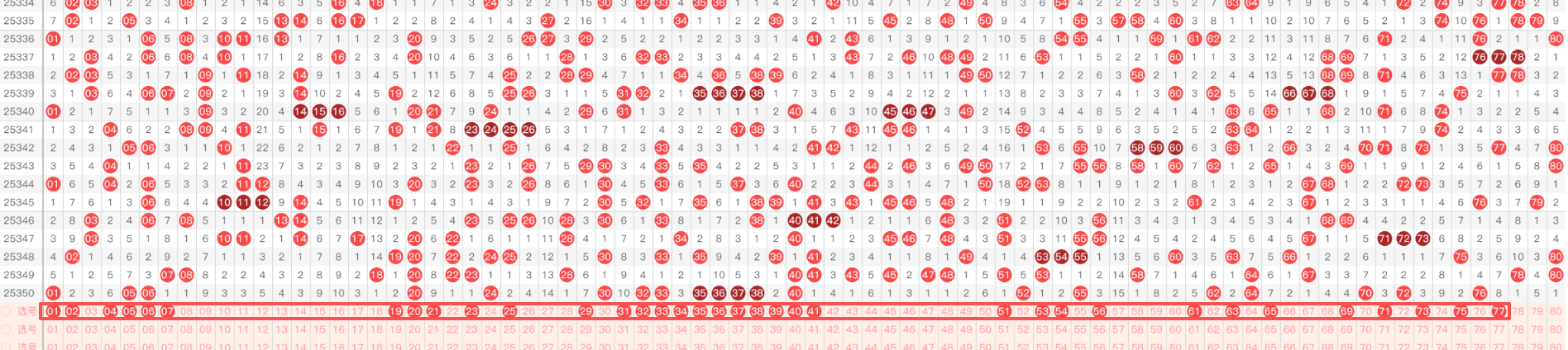 3.连号与重号快乐8中连号(如12、13)和重号(与上期相同的号码)出现的概率较高。每期开奖号码中通常会有25个连号或重号,选择时可以适当关注这些号码。