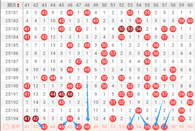 上期当前区段开出5个号码球,再结合前5期出号情况来看当前区段落号率在下降,因此半段本期当前区段出号可能在5个以下,我们再来看下边码,192期开出51.58边码号,193期开出59边码号,194期没有开出边码号,跟据近几期来看 ,基本每期都会开出1到2个边码号,因此判断本期当前区段可能存在1个以上边码号。再来看看重叠号,最近10期都有重叠号码开出。本区段建议保留1到2个号码作为重叠号。接下来看当前区段连号,最近10期基本都有出现连号,上期本区段没有开出连号,本期建议关注53-57之间可能开出连号。本区段重点关注遗漏数据3-6之间号码。