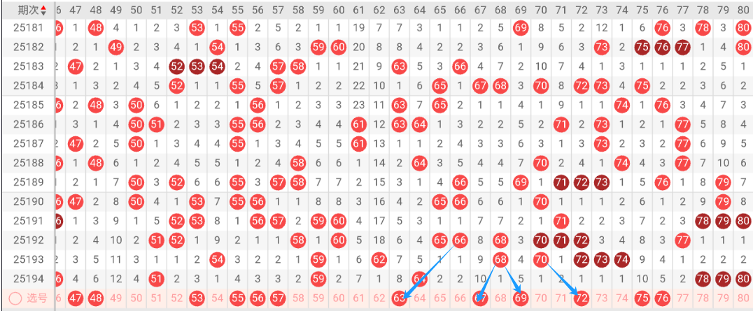 上期当前区段开出4个号码球,再结合前5期出号情况来看当前区段落号率下降,因此半段本期当前区段出号可能在4个以上,我们再来看下边码,192期开出70.72.77边码,193期开出73边码号,194期没有开出边码号,跟据近几期来看 ,基本每期都会开出1到2个边码号,因此判断本期当前区段可能存在1个以上边码号。再来看看重叠号,最近10期都有重叠号码开出。本区段建议保留1到2个号码作为重叠号。接下来看当前区段连号,最近10期基本都有出现连号,上期本区段开出78.79.80连号,本期建议关注69-76之间可能开出连号。本区段重点关注遗漏数据2-5之间号码。