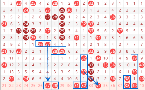 本期的连号26 27和连号28 29我们要注意落号情况了,本期重点关注一下27 28号数字的落号情况。本期的31号数字我们要注意一下出号情况,它是属于遗漏6期的号码,本期遗漏6期的号码我们就关注一下31 46的出号情况就可以了。本期的32 34我们要注意一下,上期33号数字出了3重,那么本期有可能是要分边的。本期的38 39号数字我们要注意一下,尤其是39号数子出号机会很大,我们要注意一下。