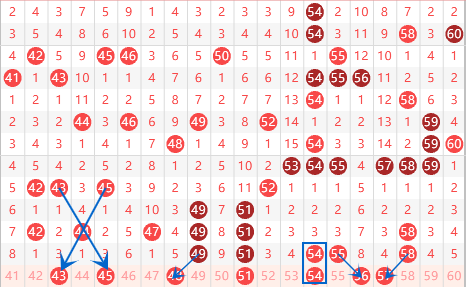 本期的43 45号数字是属于交叉对称号码,本期我们要注意一下,而且67 69号数字也是同种类型的号码,本期这4个号码应该是要有号码出来,我们就重点关注一下43 45的出号情况就行了。上期49 51都出了3重号,本期我们要注意有一个出现4重号的情况,重点关注一下51号数字出4重的情况。上期开出了54 55连号,本期我们要注意出一个重号的情况。
