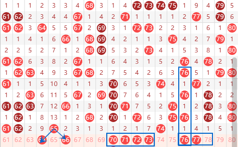 上期开出了65号数字,它是属于冷号,所以本期我们要注意一下分边的情况,重点考虑一下64号数字出号情况。本期的69 70 71号数字我们要注意落下号码的情况,由于上期4重号70号数字没能分边,本期有可能会出现回补情况,我们要重点考虑一下。本期的73号数字我们可以注意一下,出号机会还是有的,它是三斜连号码,也是复制号码,我们可以防守一下的。连号空一带号75 76 78本期我们我们也是要注意一下回补的情况,重点考虑一下76 77号数字的出号情况。