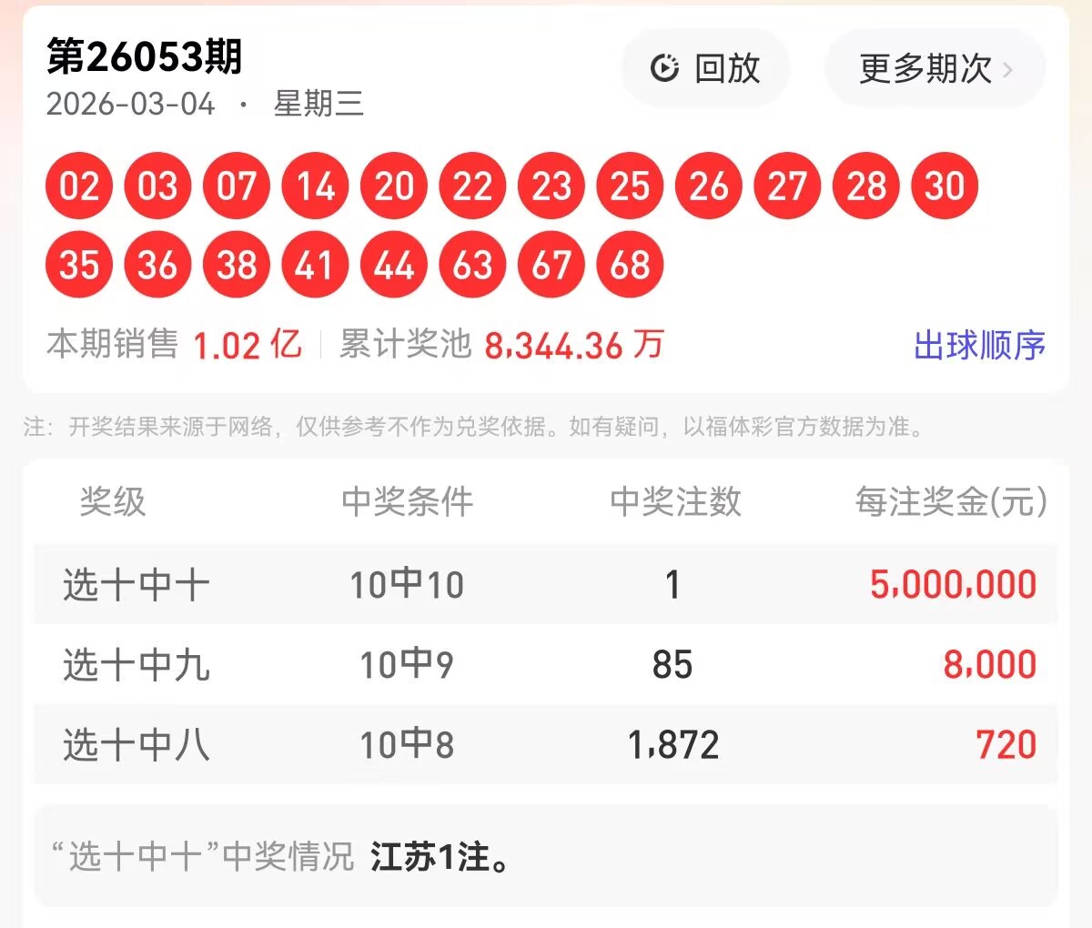 上期福彩快乐8第 2026053期开奖号码为【02 03 07 14 20 22 23 25 26 27 28 30 35 36 38 41 44 63 67 68】,其中大小比5:15,奇偶比为9:11,和值为619,跨度66,四区间比为5:10:2:3。下面是对本期对于每个号码的详细分析。