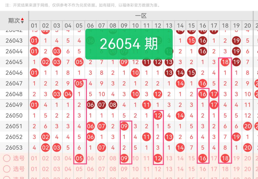 上期第一区间开奖5个号码,本期可能会稳定开出。05处于区间前端,衔接上期首尾过渡位,走势平顺;09为区间中段关键点位,奇偶适配性佳,与周边号码联动性强;12居中稳定,承上启下,平衡区间出号节奏;16靠近区间后半段,补齐尾部热度,分散选号重心;18收尾稳当,与16形成呼应,让一区覆盖更完整。