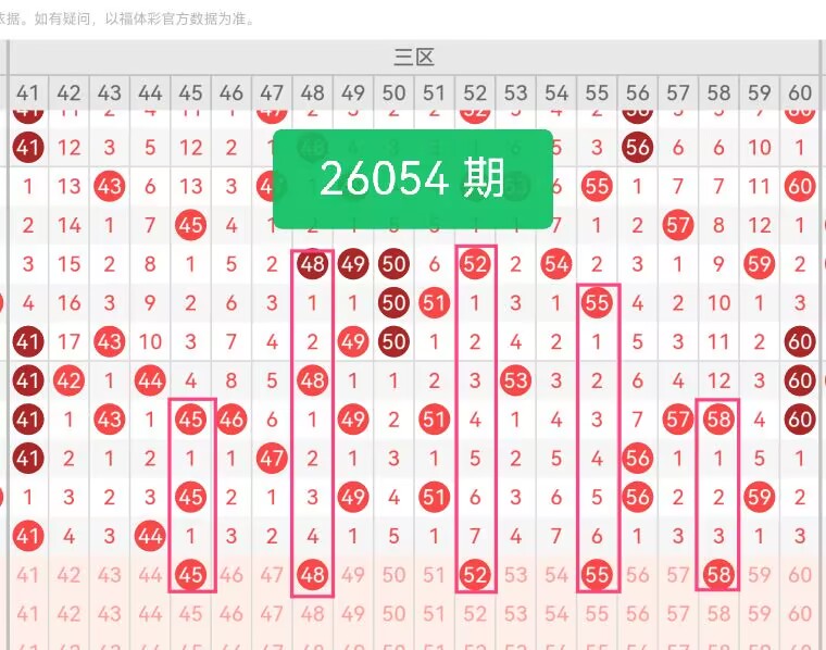 上期第三区间开奖2个号码,本期可能会增加开出。45开启三区热度,前端稳扎,为区间出号打底;48居中过渡,衔接前后,平衡区间节奏;52为中段核心,点位关键,与周边号码适配性强;55靠近后半段,承接热度,延续区间活跃性;58收尾饱满,补齐三区尾部,让区间出号完整均衡。