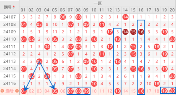 该区间的01 05号数字我们注意出一个号码的情况,重点关注一下05号数字的出号情况。上期开出了10号数字,本期我们注意一下08 09号数字出一个号码的情况,这里是有很大机会出一个号码的。本期的13号数字是属于323走势,出号机会还是很大的,我们重点关注一下。上期开出了18号数字,本期我们注意16 20号数字出一个号码的情况,可以重点关注一下16号数字的出号情况。