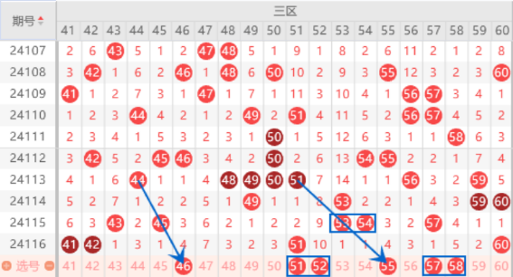 本期的46号数字我们注意一下出号情况,可以关注一下。上期开出了41 51号数字,本期我们注意出一个重号的情况,可以重点关注一下51号数字出重的情况。本期的52号数字是属于遗漏10期的号码,本期遗漏10期的号码有2个,我们防守出一个号码的情况就行了。本期的57 58号数字我们注意出一个号码的情况,可以防守一下57 77号数字同出的情况。