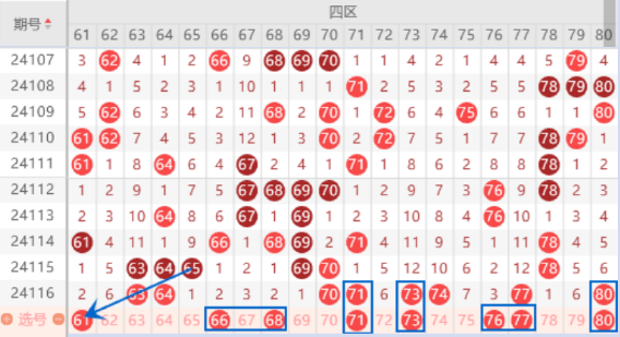 本期的61号数字我们注意一下出号情况,从尾数上看,走势是非常好的号码,我们要注意一下。本期的68号数字我们重点关注一下,出号机会是非常大的,属于212走势,本期这种走势的号码有两个,我们要注意出一个号码的情况。上期开出了70 71 73 74号数字,本期我们注意一下出重号的情况,重点关注一下71 73号数字出重的情况就行了。上期开出了73 80号数字,本期我们注意一下76 78号数字开出一个号码的情况,可以重点关注一下76号数字的出号情况。
