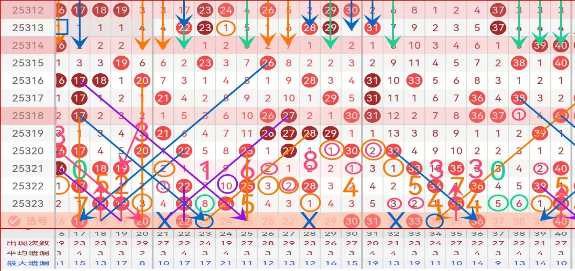 区间推荐主做号码22 26 30 31 33 36 40 防守号码23 34;