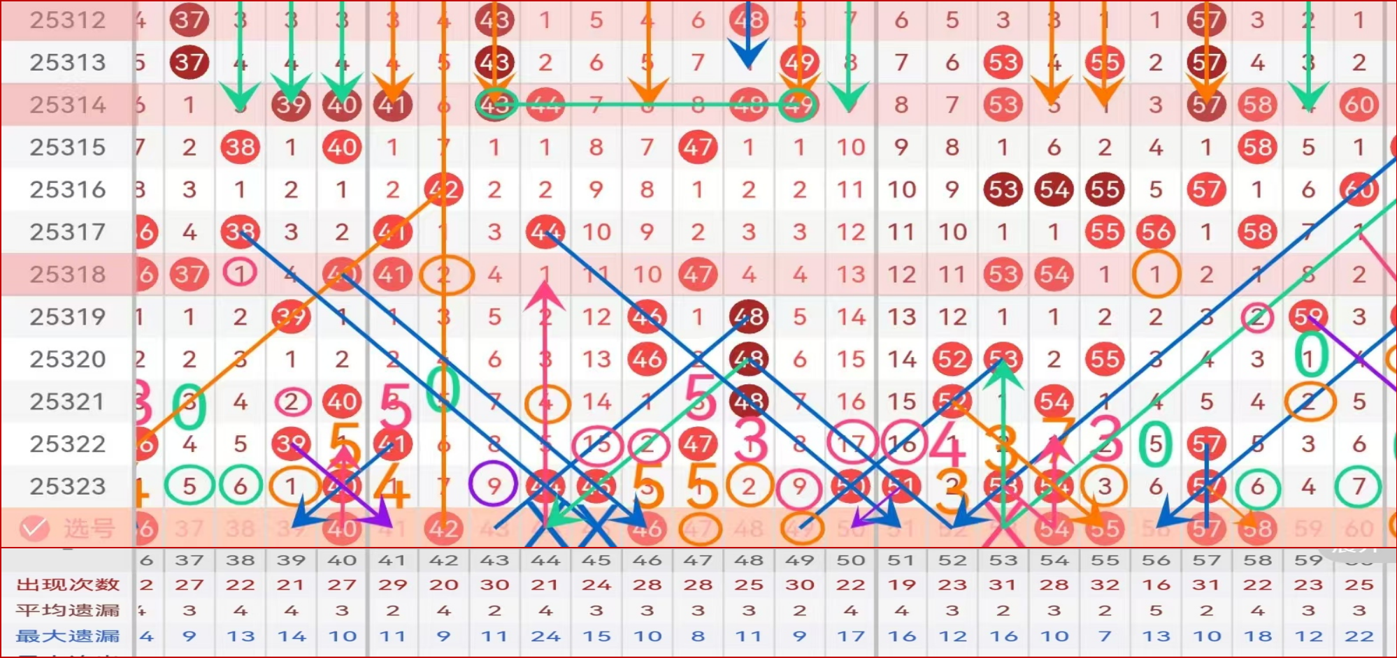 三区间上期出了3个号码,冷态开出;梅花右分边,41,以防为主,不宜胆码;7漏7的42,第三次走遗漏7的号码球,没有百期值数据支持,可做防漏44 45这里本期九哥双码规避,分边43 46二择一推荐46,高数据,第六次走遗漏3,也是大遗漏落球关注分边码的点位,可主防46可带47做连号防守;50 51连号下面,属于大遗漏落球,遵循大遗漏落球不走重的形态,建议放弃做号,小防49高数据,分边52夹心码,点位形态码,小防即可;53 54连号下面,可做高分边属性码54带上分边高数据55做连号主防,53可数据规避风险码;双重57,孤码三重必防码,可做右分边58连号主防,二择一主做57;尾部59 60观察,非要做,推荐59小防;