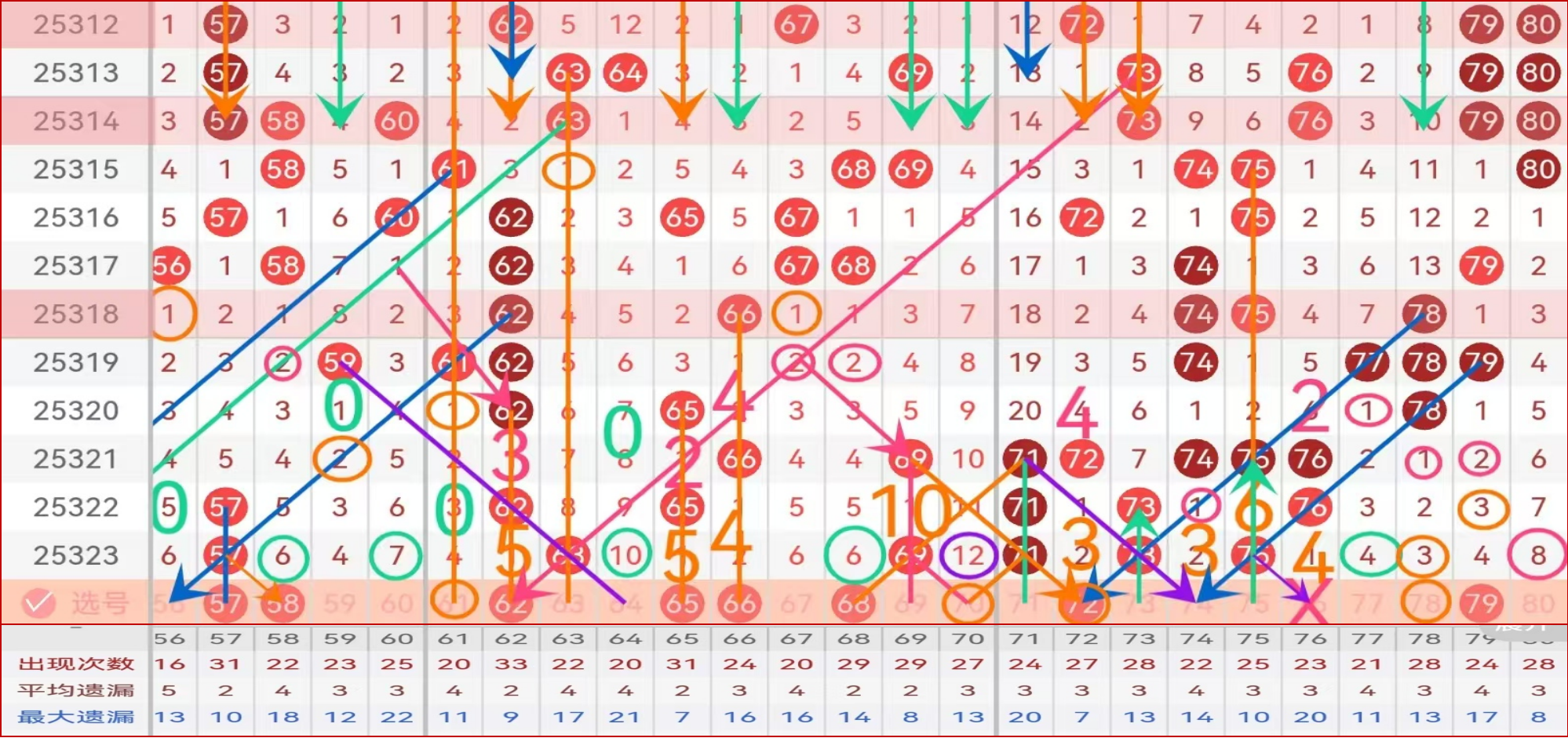 四区间上期开出了5个号码球,均值开出;61 62推荐走势数据码62主做,61 的对称遗漏点位,没有数据支持,以防为主;走重对称的63本期九哥不看重;64独十号码球,介于分边属性低的三斜连点位码,不推荐,甚至想规避64这个号码球;第六次走遗漏一的65可带66做连号防守,二择一主胆推荐65;孤码69小数据,连个分边码68 70,均属高分边属性码,可选择性根据组合需要做号,本期68 69 70是不错的拖码选择;夹心码72,左右均属空位斜连回补码,高数据可做防;上期73,7期值走重,百期值未曾三重形态,本期可考虑是否三重,小防;74 75本期建议放弃;76形态规避码;尾部77 78 79 80推荐79主做,防守78的思路做号;