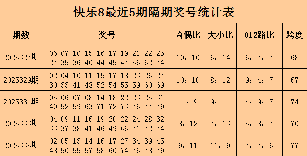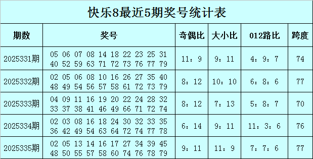 福彩快乐82025335期开奖回顾:02 05 13 14 16 17 27 34 39 45 48 50 55 57 58 60 74 76 78 79,其中奖号奇偶比开出911,大小比开出119012路比开出776,和值为847,跨度为77