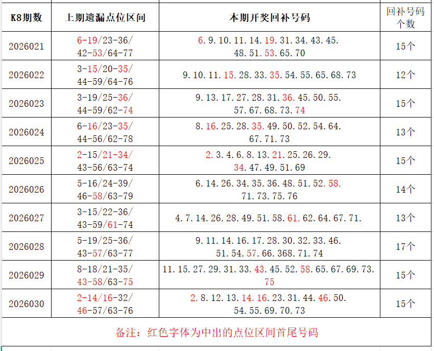 如图,上期的遗漏号码在下期开出10个左右,即为回补号码。定准点位区间首尾号码是关键!以上期2026030期为例,定位4个遗漏区间,围中15码!结合上期开奖号码,以跨度值大于或等于7为依据,本期关注4个遗漏区间:16-23/23-31/61-69/73-80;重点关注遗漏区间:3-15/24-38/43-56/60-75。点位区间号码和大底号码请勿混淆,个人分析,仅供参考。