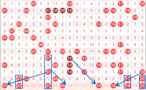 该区间的上期开出了03 04号数字,本期我们要注意走重的情况,如果本期的03号数字走重,那么72号数字就应该是重不了了,但是从走势上来看,72出重的机会比03号数字大,所以我们防守一下03号数字的重号就可以了。本期我们要注意一下07 09号数字的出号情况,尤其是07号数字是属于空一对称,本期空一对称号码有5个,出2个机会还是有的。本期我们要注意一下14 16同出的情况,都是三斜连号码,还是有机会出来的。