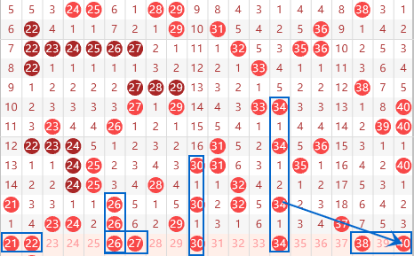 该区间的21 22我们要注意出一个号码的情况,尤其是21号数字,如果本期的21号数字出不来,那么我们就要注意61号数字的出号情况,或者两个也可以同时出来的。本期我们可以注意一下20 26中有一个出3重号的情况,重点考虑一下26号数字走三重的情况。本期的27号数字我们也是可以关注一下的,出号机会也是有的。本期的34号数字是属于121走势,我们可以关注一下,出号机会还是有的。