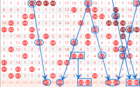 本期的47号数字我们可以关注一下,属于大长三斜连,又是246走势,我们可以重点考虑一下。本期的49 46 47 59我们要重点关注一下,都是属于长斜连号码,本期有可能会落下两个号码,我们可以重点关注一下。本期我们要注意一下连号51 53和连号58 59落号的情况,这里应该会出一个号码来,我们重点关注一下52 59的出号情况。