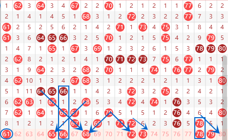 本期的61号数字是属于遗漏8期的号码,本期是有机会出来的,我们可以防守一下。65 66我们要注意一下,尤其是66号数字是属于空一对称号码,我们要重点考虑一下。本期的68 70两个夹号我们要考虑出一个号码的情况,尤其是68号数字出号情况是很可观的。上期开出了78号数字,本期我们要注意走重的情况,分边的情况也是要考虑的。