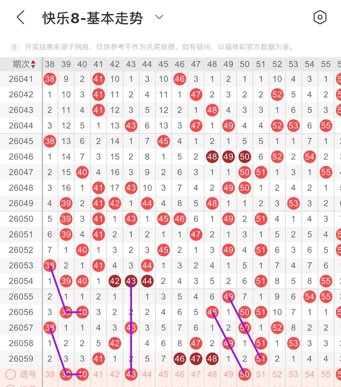 51-60区:本区间上期开出了两个号码,从号码走势图上看,该区现属于温冷区,出号个数在两个号码左右,有出号走势的的号码有56.58号,直接做分边出号考虑。
