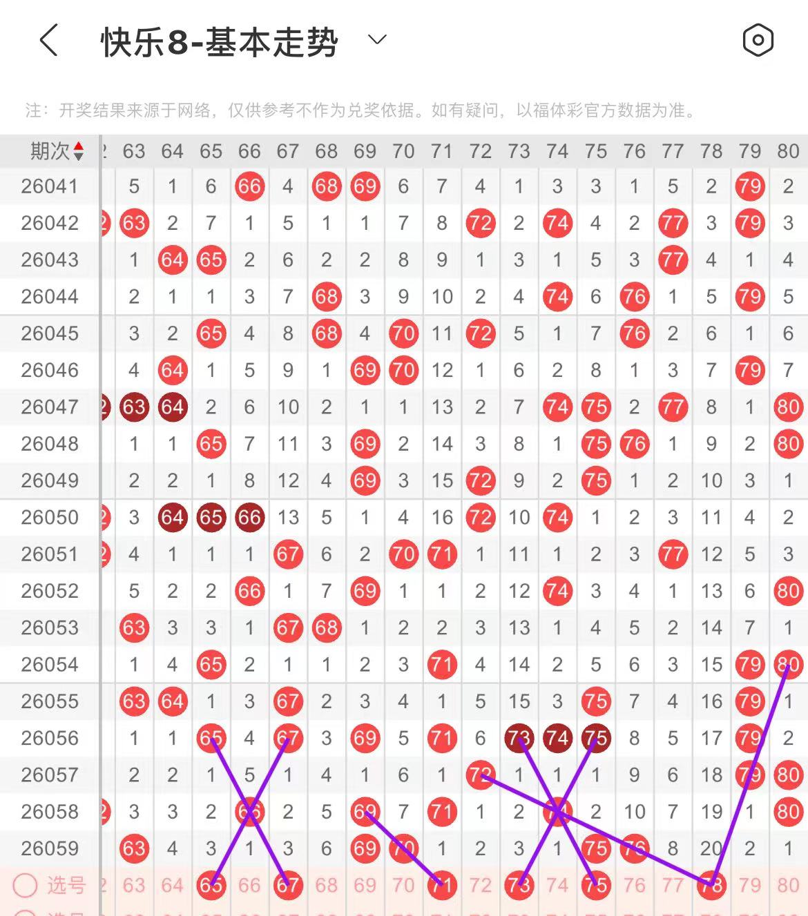 71-80区:本区间上期开出了两个号码,从号码走势图上看,本期号码走势比较强势,注意出号个数有突增的可能,在选号上可考虑多做选择,有出号走势的号码有71号,斜连且隔期相同出号走势,73.75号,交叉斜连出号走势,78号,双线斜连出号走势。