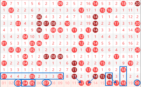 本期的03 07都是空三中心号,而且都是连在一起的,我们要注意出一个号码的情况。本期的的04 06 12号数字都是空二对称号码,我们也是要注意出一个号码的情况,重点关注一下04 12号数字的出号情况。上期开出了三连号14 15 16,本期我们要注意一下出重号的情况,重点关注一下15 16号数字出重号的情况。本期的20号数字我们可以关注一下,出号机会还是有的。