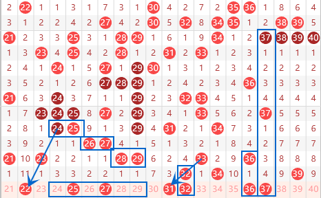 本期的22 51 65号数字都是属于遗漏11期的号码,本期我们要注意出一个号码的情况,重点关注一下22 65号数字的出号情况,尤其是22号数字的出号情况出号机会是很大的。本期的连号24 25和连号26 27和连号28 29是属于阶梯是下降类型,本期这里我们要注意出2个号码的情况,我们重点关注一下25 27号数字的出号情况就可以了。本期的31号数字我们要注意一下,防守31 32同出的情况。本期的37号数字是属于空4对称号码,可以关注一下。